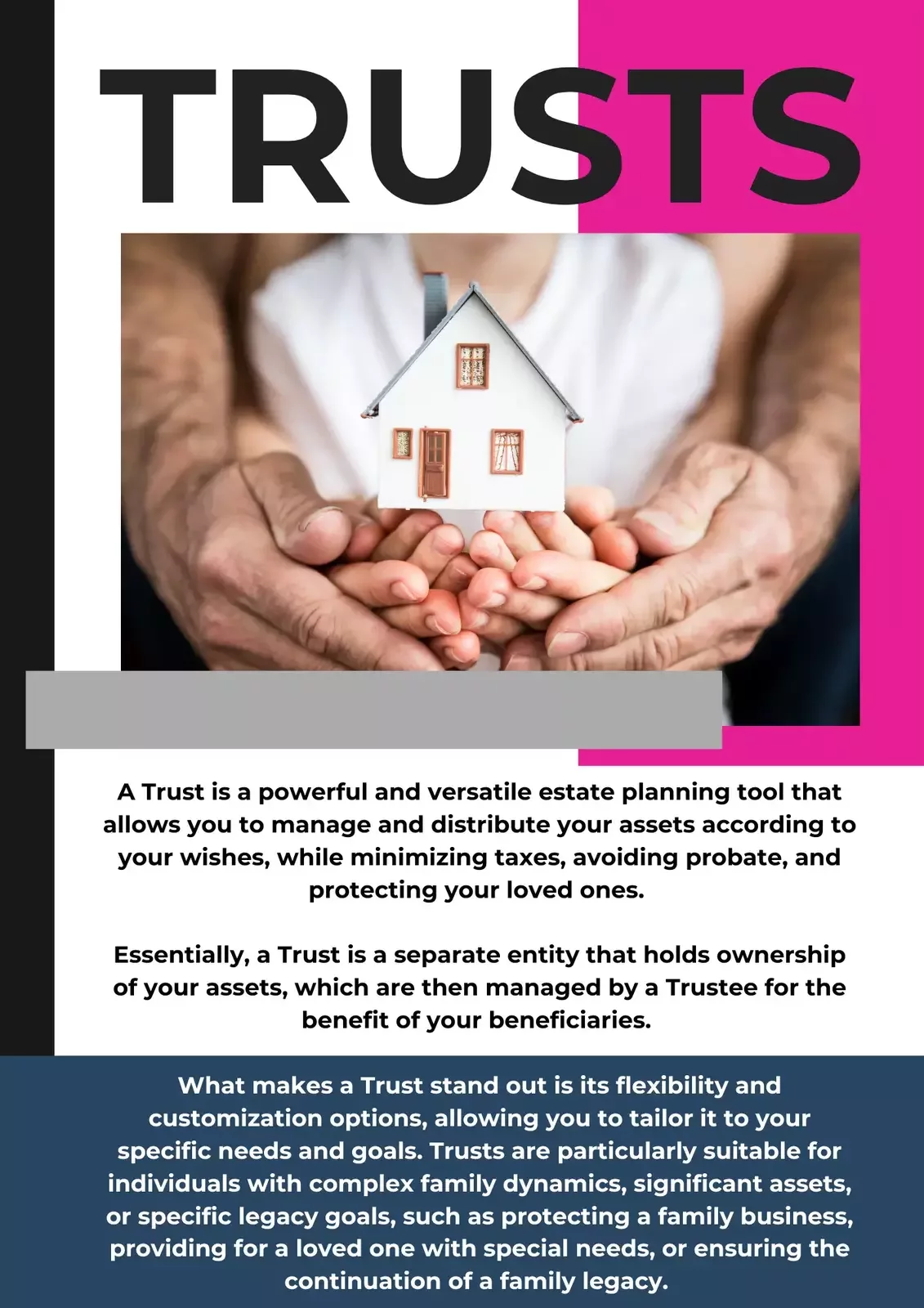 Trust: A Trust is a separate entity that holds ownership of your assets, which are then managed by a Trustee for the benefit of your beneficiaries. The primary purpose of a Trust is to manage and distribute your assets according to your wishes, while minimizing taxes, avoiding probate, and protecting your loved ones.