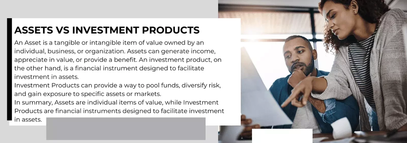 - Structure: Assets are individual items of value, while investment products are financial instruments designed to facilitate investment in assets.